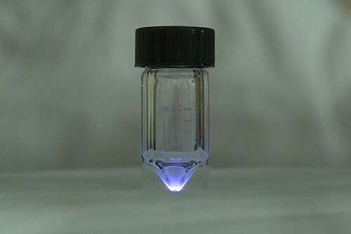 ![]() Muestra de Actinio-225. Nótese el resplandor azulado que se origina por la ionización del aire por las partículas alfa. | ||||||||||||||||||||||||||||||||||||||||||||||||||||||||||||||||||||||||||||||||||||||||||||||||||||||||||||||||||||||||||||||||||||||||||||||||||||||||