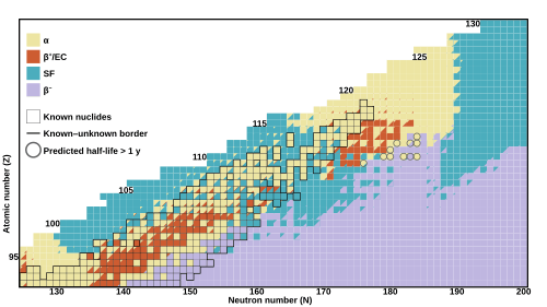 - ↑ Koura, H. (2011). Decay modes and a limit of existence of nuclei in the superheavy mass region. 4th International Conference on the Chemistry and Physics of the Transactinide Elements. Consultado el 18 de noviembre de 2018.