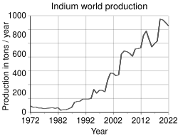 Su condición de subproducto significa que la producción de indio está limitada por la cantidad de minerales sulfídicos de zinc (y cobre) que se extraen cada año. Por lo tanto, su disponibilidad debe analizarse en términos de potencial de suministro. El potencial de suministro de un subproducto se define como la cantidad que es económicamente extraíble de sus materiales anfitriones por año en las condiciones actuales del mercado (es decir, tecnología y precio).[22] Las reservas y los recursos no son relevantes para los subproductos, ya que no pueden ser extraídos independientemente de los productos principales.[20] Estimaciones recientes sitúan el potencial de suministro de indio en un mínimo de 1.300 t/año a partir de minerales de zinc sulfídico y 20 t/año a partir de minerales de cobre sulfídico.[20] Estas cifras son significativamente mayores que la producción actual (655 t en 2016).[23] Por lo tanto, será posible que se produzcan importantes incrementos futuros en la producción de subproductos de indio sin que se produzcan aumentos significativos en los costes de producción o en el precio. El precio medio del indio en 2016 fue de 240 dólares/kg, por debajo de los 705 dólares/kg de 2014.[24]