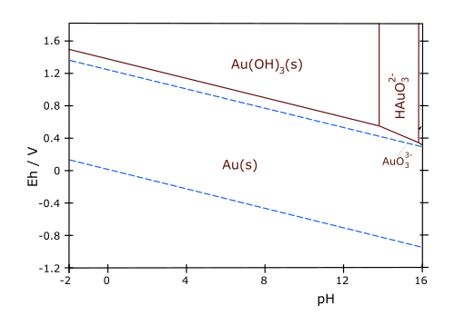 El ion dicianoaurato [Au(CN)2]- de gran importancia metalúrgica se forma con facilidad cuando se hace reaccionar oro con disoluciones de cianuros en presencia de aire o agua oxigenada. El Au(III) es d8 e isoelectrónico con Pt(II), teniendo sus complejos preferencia por la geometría plana cuadrada. La disolución de oro en agua regia o de Au2O3 en ácido clorhídrico concentrado nos da el ion tetracloroaurato(III), [AuCl4]-, que se usa como “oro líquido” para decorar cerámicas y vidrios, ya que cuando se calienta deja una película de oro. La evaporación de estas disoluciones producen cristales amarillos de (H3O)[AuCl4].3H2O; las disoluciones acuosas de esta sal generan un medio fuertemente ácido. Este anión tetracloroaurato(III),[AuCl4]-, se hidroliza fácilmente a [AuCl3OH]-.
