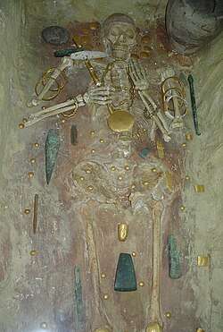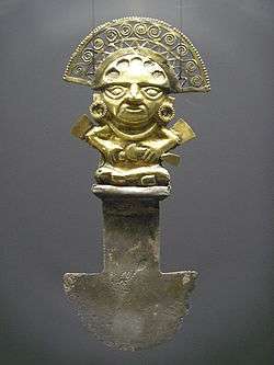 Por otra parte, los Incas poseían grandes cantidades de oro en sus palacios y templos de Cusco,[5] ya que asociaban el material con el sol Inti, la deidad patrona del imperio. Algunos textos de conquistadores como Pedro Cieza de León y sus crónicas Conquista del Tahuantinsuyo afirman que en el Coricancha existía una habitación que contenía paredes, esculturas y utensilios hechos completamente de oro, además de un jardín con llamas, árboles y animales autóctonos en tamaño real hechos de este metal. Cuando los conquistadores capturaron al emperador inca Atahualpa, éste prometió llenar una habitación completamente de oro a cambio de su libertad. Esto se cumplió, pero aun así, los españoles terminaron por ejecutarlo debido a que su liberación podía suponer un gran obstáculo en la conquista del Perú.[6][7] Son de referencia internacional el Tumi de oro de Lambayeque hallado en 1936 y la Máscara Sicán hallado en la época de 1990.[8][9]