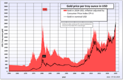 - En septiembre de 2025 el precio del oro alcanzó un nuevo récord histórico al alcanzar los 3.751,02 dólares por onza troy.[32] En diciembre el oro subió a 4.420,30 dólares la onza.[33]
