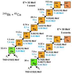 El experimento comenzó en junio del 2009 y en enero del 2010 científicos del Laboratorio Flerov de Reacciones Nucleares anunciaron que habían detectado con éxito la desintegración de un nuevo elemento con número atómico 117 a través de dos cadenas de isótopos impar-impar mediante seis desintegraciones alfa antes de una fisión espontánea, y de otro par-impar,[nota 3] con tres desintegraciones alfa antes de la fisión.[21] Según el informe oficial publicado el 9 de abril de 2010 en la revista Physical Review Letters, dichos isótopos eran el teneso-294 y el teneso-293 respectivamente, formados como sigue a continuación:[19]