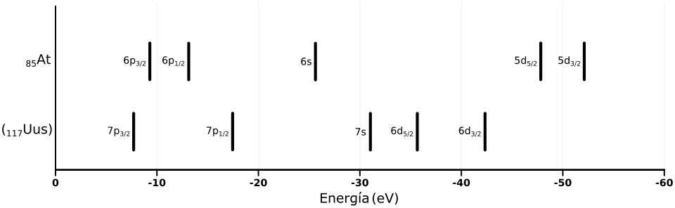 Sin embargo, también es probable que surjan algunas diferencias notables, a las que contribuirá en gran parte la interacción espín-órbita entre el movimiento de los electrones y su espín. Esta interacción es especialmente fuerte para los elementos superpesados, porque sus electrones se mueven mucho más rápidamente que los electrones en elementos más livianos, a velocidades comparables a la velocidad de la luz.[42] A consecuencia de ello, disminuyen los niveles de energía de los niveles 7s y 7p —estabilizando los correspondientes electrones—, pero dos de los niveles de energía 7p están más estabilizados que los otros cuatro.[43] La estabilización de los electrones de 7p se conoce como el efecto del par inerte, y al efecto de dividir la subcapa 7p en dos partes con distinta estabilidad se le llama división de subcapa. En química computacional se describe esta división como un cambio del número cuántico azimutal ℓ de 1 a 1/2 y 3/2 para las partes más y menos estabilizadas de la subcapa 7p, respectivamente.[44][nota 5] Para reflejar la división de la subcapa 7p para propósitos teóricos, la configuración del electrón de valencia se representa como 7s2