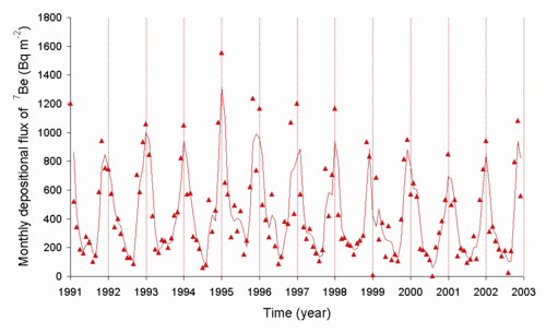 - ^ a b Yamamoto, Masayoshi; Sakaguchi, Aya; Sasaki, Keiichi; Hirose, Katsumi; Igarashi, Yasuhito; Kim, Chang Kyu (January 2006). "Seasonal and spatial variation of atmospheric 210Pb and 7Be deposition: features of the Japan Sea side of Japan". Journal of Environmental Radioactivity. 86 (1): 110–131. doi:10.1016/j.jenvrad.2005.08.001. PMID 16181712.