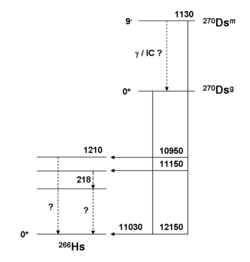 The direct production of 270Ds has clearly identified two nuclear isomers. The ground state decays by alpha emission into the ground state of 266Hs by emitting an alpha particle with energy 11.03 MeV and has a half-life of 0.10 ms. The metastable state decays by alpha emission, emitting alpha particles with energies of 12.15, 11.15, and 10.95 MeV, and has a half-life of 6 ms. When the metastable state emits an alpha particle of energy 12.15 MeV, it decays into the ground state of 266Hs, indicating that it has 1.12 MeV of excess energy.[21]