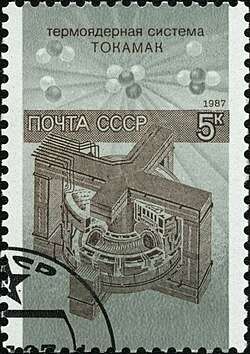 A 1987 Soviet stamp celebrating the T-15 tokamak depicts the helium-5 nucleus during deuterium–tritium fusion