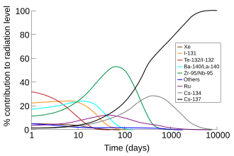 The portion of the total radiation activity (in air) contributed by each isotope versus time after the Chernobyl disaster, at the site. Note the prominence of radiation from I-131 and Te-132/I-132 for the first week. (Image using data from the OECD report, and the second edition of 'The radiochemical manual'.[4])