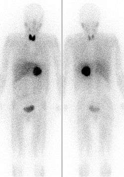 Iodine-124 as the iodide salt can be used to directly image the thyroid using positron emission tomography (PET).[12] Iodine-124 can also be used as a PET radiotracer with a usefully longer half-life compared with fluorine-18.[13] In this use, the nuclide is chemically bonded to a pharmaceutical to form a positron-emitting radiopharmaceutical, and injected into the body, where again it is imaged by PET scan.