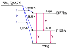 The decay of 198Au (shown) is relatively simple, involving only three levels of the daughter product nucleus. 99% of decaying atoms follow the path to the middle level, and thus emit a beta particle with maximum energy 961 keV (the rest goes to the neutrino) and a single gamma ray of energy 412 keV (converted about 4%).[3]