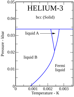 Phase diagram for helium-3 ("bcc" indicates a body-centered cubic crystal lattice.)