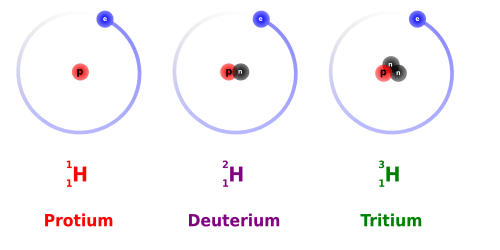 The three most stable isotopes of hydrogen: protium (A = 1), deuterium (A = 2), and tritium (A = 3)