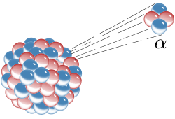 )的原子核。α衰變發生後,原子核的質量數(A)會減少4個單位,其原子序(Z)也會減少2個單位。[1][2]其通式為: