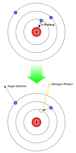 由于质子在电子俘获过程之中“变成”了中子,核素的质子数减少1,中子数增加1,而原子量保持不变。通过改变质子数,电子俘获可以改变元素的种类。新产生的这个原子,虽然仍然保持电中性,但是由于缺失了一个内层电子,故在能级上处于激发态。在这个原子跃迁到基态的过程之中,会释放特性輻射(电磁辐射的一种)或产生俄歇效应,也有两种过程都发生的情况。除此之外,激发态的原子还经常发射出伽马射线使自身跃迁到基态。