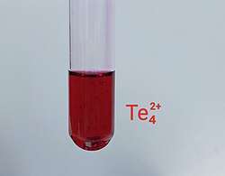 碲不溶于水和盐酸,可以和硝酸或硫酸反应。和金反应产生碲化金。碲和同族的一样,在空气中燃烧的产物是二氧化物——TeO2[10]