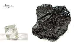 透明(鑽石)或黑色(石墨)![]() 鑽石(左)和石墨(右)是碳最常見的兩種同素異形體。 | |