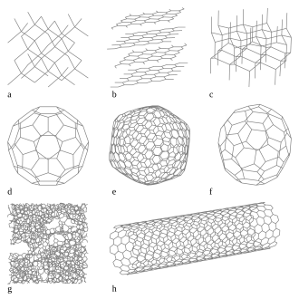單原子碳的存活時間極短,因此碳一般以多原子形態穩定存在,這些碳原子的不同排布方式稱為同素異形體。最常見的三種碳同素異形體為無定形碳、石墨及鑽石。富勒烯曾經是新發現的奇異物質,但今天已大量生產,受到了科學家的深入研究。富勒烯共包括巴基球、[26][27]碳納米管、[28]碳納米芽[29]及碳納米纖維等。[30][31]其他同素異形體還有:藍絲黛爾石、[32]玻璃碳、[33]碳納米泡沫[34]及直鏈乙炔碳等等。[35]