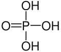 最常见的磷化合物是磷酸盐(),它是一个呈四面体的阴离子。[9]其一个很重要的作用是用作化肥。磷酸根离子是(正)磷酸的共轭碱。磷酸是一个三元酸,所以它可以逐步转变为以下三种共轭碱: