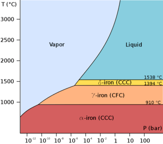 前三种铁的同素异形体可以在常压下存在。当液态的铁冷却到1538 °C以下时,它会结晶成体心立方晶系的δ-铁。继续冷却到1394 °C时,它会变成面心立方晶系的γ-铁(奥氏体)。到了912 °C以下,铁又会变成体心立方晶系的α-铁。[8]