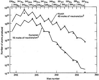 在1962至1969年間進行的9次地底核試驗中,[36]最後一次的規模最大,而其超鈾元素產量也最高。在產量與原子質量數的關係圖(左圖)中,質量較低並擁有奇數質量數的同位素有較低的產量,因而在圖中產生鋸齒形的曲線。這是因為擁有奇數核子的同位素有較高的裂變率。[35]: 40 研究中最大的問題在於採集爆炸後散落在各處的原子塵。載有濾紙的飛機只吸附到總量的4×10-14,而在埃內韋塔克環礁處所採集到的量也只增加了兩個數量級。在「Hutch」核試驗60天後提取的500公斤岩石當中也只有總量的10−7。這500公斤岩石,相比在爆炸7天後取得的0.4公斤石塊,其含超鈾元素的量只不過高出30倍。這證明超鈾元素的量與收集的岩石重量是不成正比的。[35]: 43 為了加快樣本採集的速度,人們在核試驗之前就在爆炸原點鑽出了若干個豎井,這樣爆炸就會把足夠的樣本從中心通過豎井帶到地表,方便採樣。該方法在「Anacostia」和「Kennebec」核試驗中得到嘗試,並立即為研究提供了數百公斤的物質,但是其中錒系元素的濃度比通過鑽地取得的樣本的少三倍。這種方法雖然能夠有效幫助研究存留時間短的同位素,但卻無法提高整體錒系元素的產量。[35]: 44