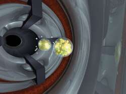 Ca-48離子加速撞擊Am-243目標原子的模擬圖