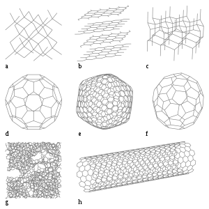 單原子碳的存活時間極短,因此碳一般以多原子形態穩定存在,這些碳原子的不同排布方式稱為同素異形體。最常見的三種碳同素異形體為無定形碳、石墨及鑽石。富勒烯曾經是新發現的奇異物質,但今天已大量生產,受到了科學家的深入研究。富勒烯共包括巴基球、[25][26]碳納米管、[27]碳納米芽[28]及碳納米纖維等。[29][30]其他同素異形體還有:藍絲黛爾石、[31]玻璃碳、[32]碳納米泡沫[33]及直鏈乙炔碳等等。[34]